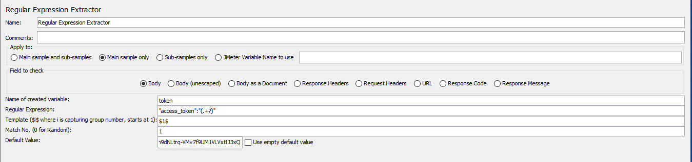In the case of PowerServer, the GetToken request gets the access token, therefore, you add a Regular Expression Extractor to the GetToken request to get and save the token into a local variable.