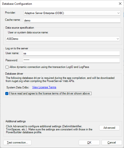 After the ODBC data source is created successfully, you should be able to select it in the Database Configuration dialog box. You can create a database connection cache for the ASE database with the following steps: