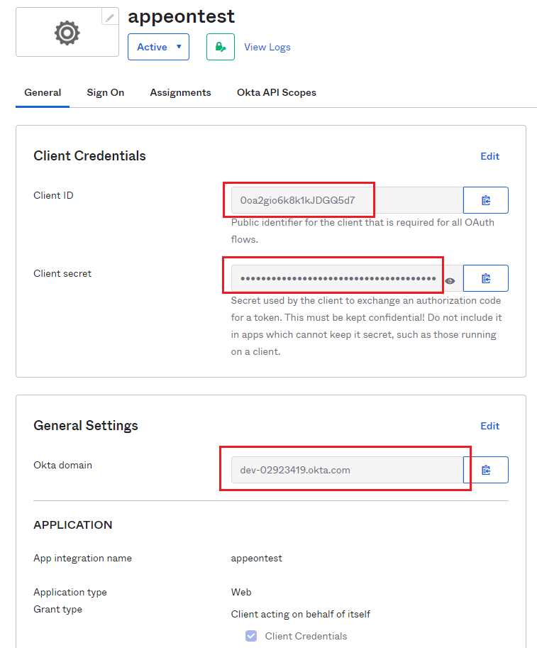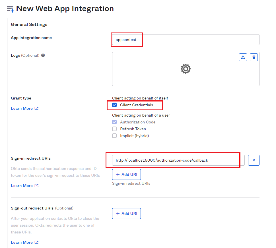 Write down the App integration name which is appeontest, select the check box of Client Credentials, and write down the Sign-in redirect URIs which is http://localhost:5099/authorization-code/callback.