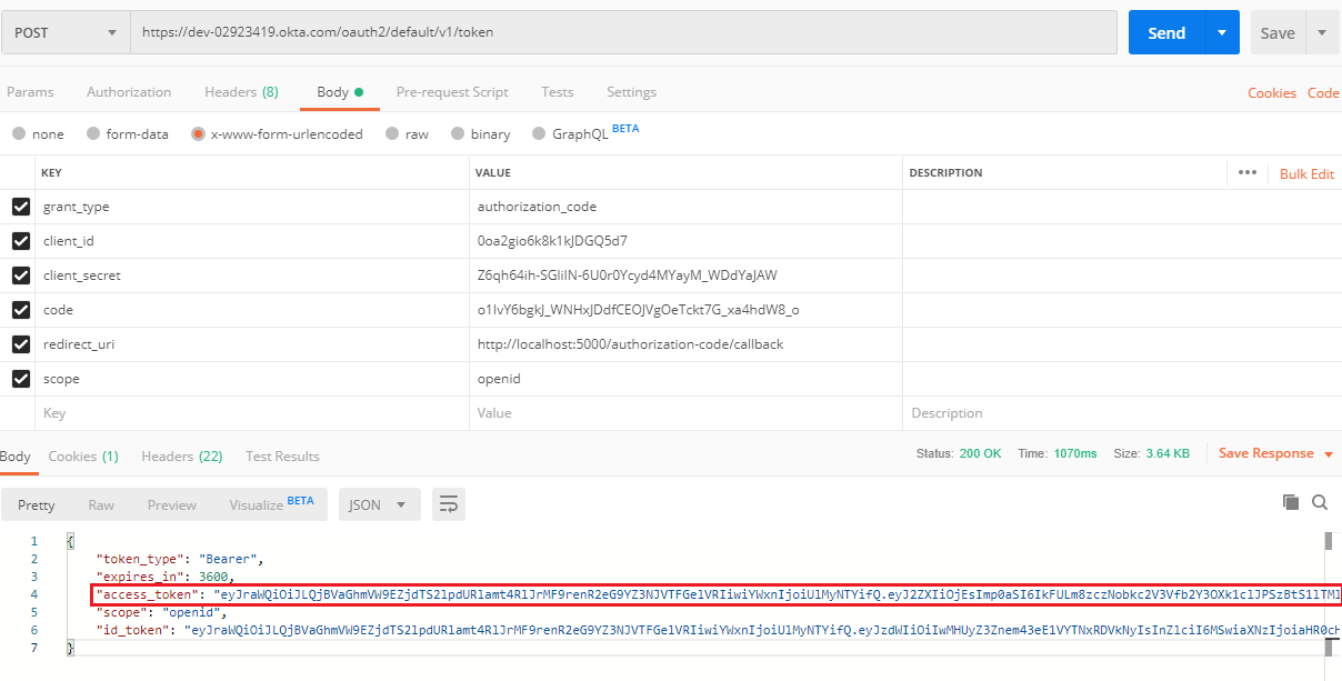 For example, if jump to the URI "http://localhost:5099/authorization-code/callback?code=o1IvY6bgkJ_WNHxJDdfCEOJVgOeTckt7G_xa4hdW8_o&state=state-296bc9a", the code will be "o1IvY6bgkJ_WNHxJDdfCEOJVgOeTckt7G_xa4hdW8_o".