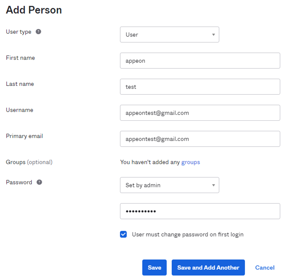 In Okta menu, select the Directory drop-down list > People page, then select Add Person to write down the basic information and click Save.