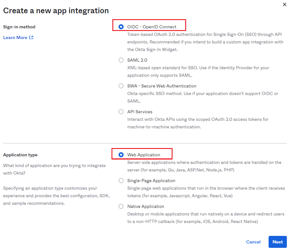 Select OIDC-OpenID Connect radio button under Sign-in method, and select Web Application radio button under Application Type, then click Next.