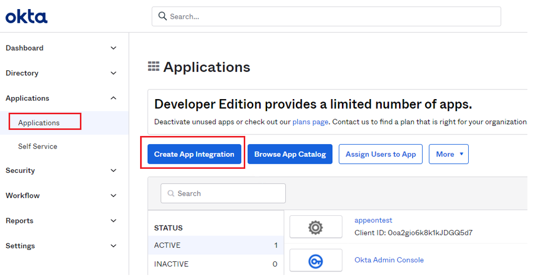 In Okta menu, select the Applications drop-down list > Applications page, then select Create App Integration button to create a new app integration.