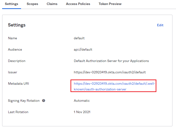 In Okta menu, select the Security drop-down list > API page to get the Issuer URI which is https://dev-02923419.okta.com/oauth2/default, and then click default for more information.