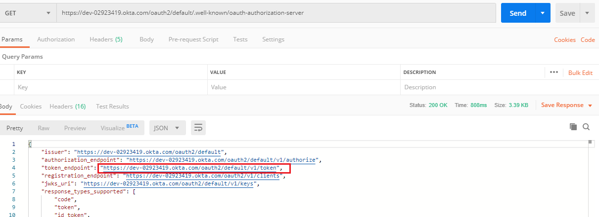 Access the URI by Postman or web browsers to get the token endpoint: https://dev-02923419.okta.com/oauth2/default/v1/token.