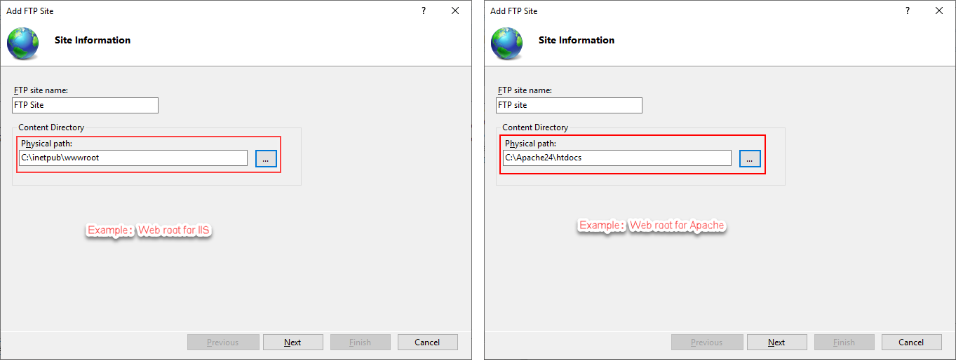 Step 2: Specify a name for the FTP site, and set the physical path to the Web root of the Web server (for example, C:\inetpub\wwwroot for IIS, C:\Apache24\htdocs for Apache, etc.). Click Next.