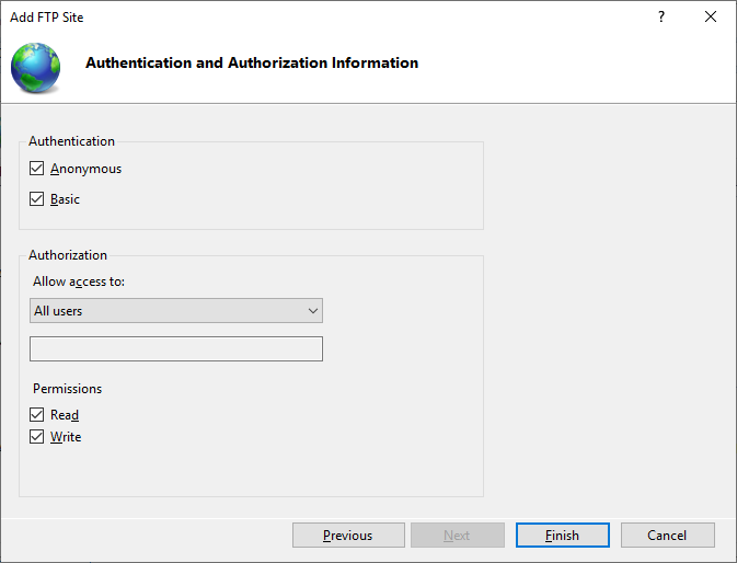 Step 4: Select Anonymous and Basic authentication. Select All users or specify the users that are allowed to access the FTP site, and then select the Read and Write permissions. Click Finish.