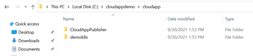 Step 1: Copy the "CloudAppPublisher" and "[appname]" folders to the local directory, for example, C:\cloudappdemo\cloudapp.