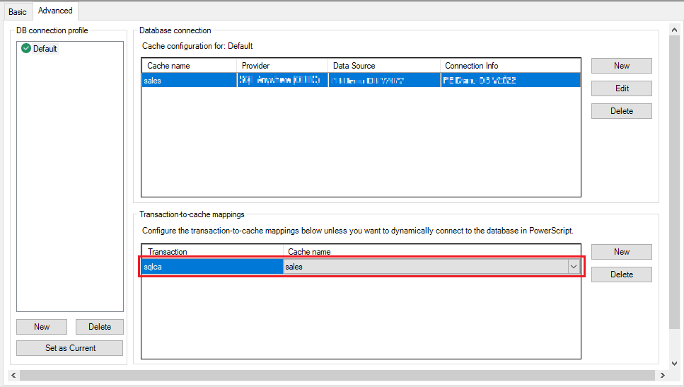 After the database cache is created, for each transaction object that already exists in the application, map it with the cache in the transaction-to-cache mappings section. The mapping will be deployed to the PowerServer, and then be used to set up static database connection for the app runtime. Note that you only need to map the transaction objects that exist in the PowerBuilder application.