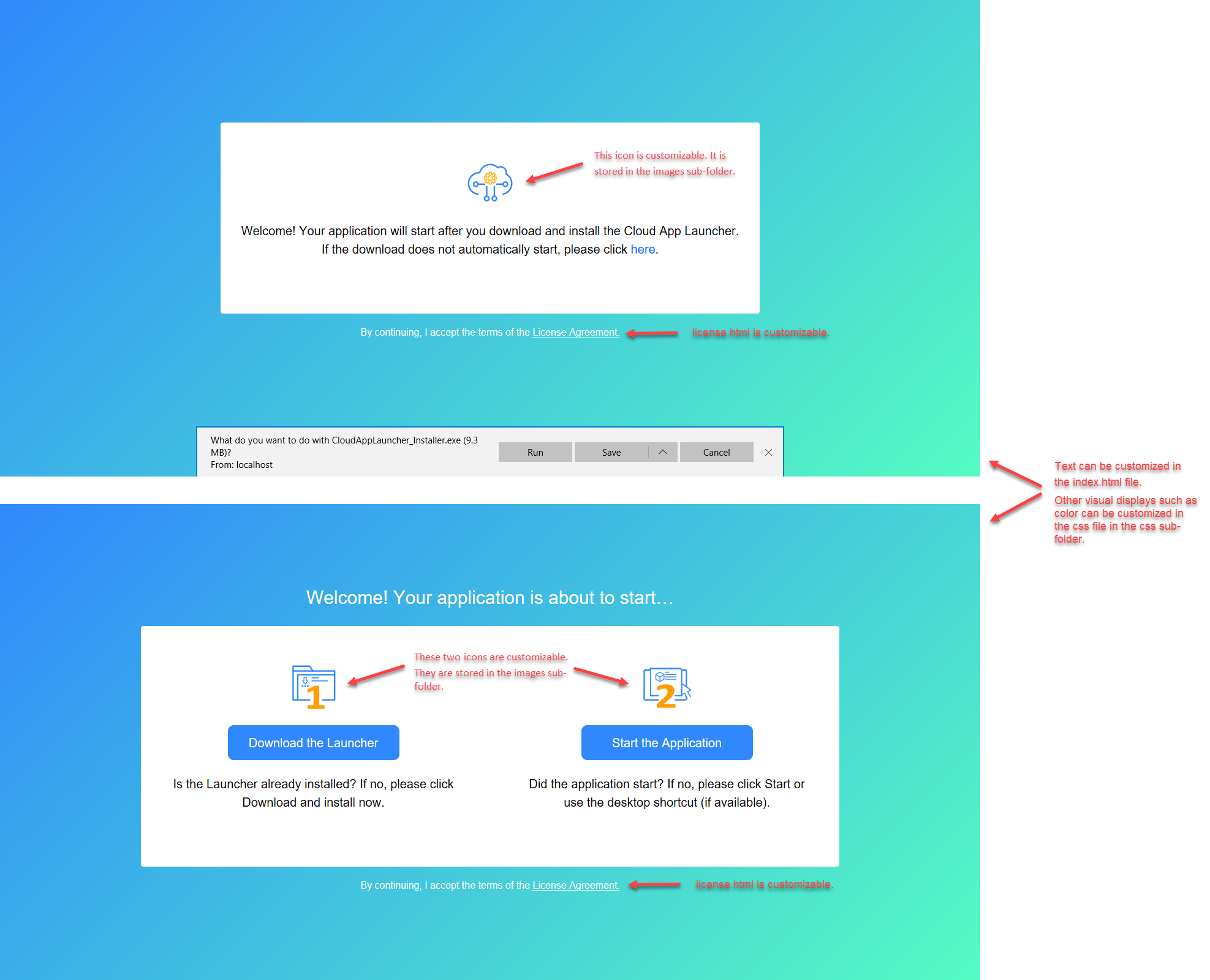 index.html is the template file for application startup. You can customize the text in this file and the color and icon in the "css" and "images" sub-folders.