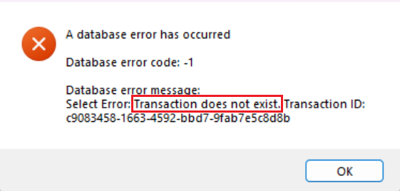 “Transaction is timeout” or “Transaction does not exist” error dialogs; DataWindow displays empty or stale data after Update; save operations appear to succeed but data is not committed; SQL error codes (SQLSTATE, database-specific error numbers) in the Web APIs log; silent failures where updates return success but nothing is written to the database.