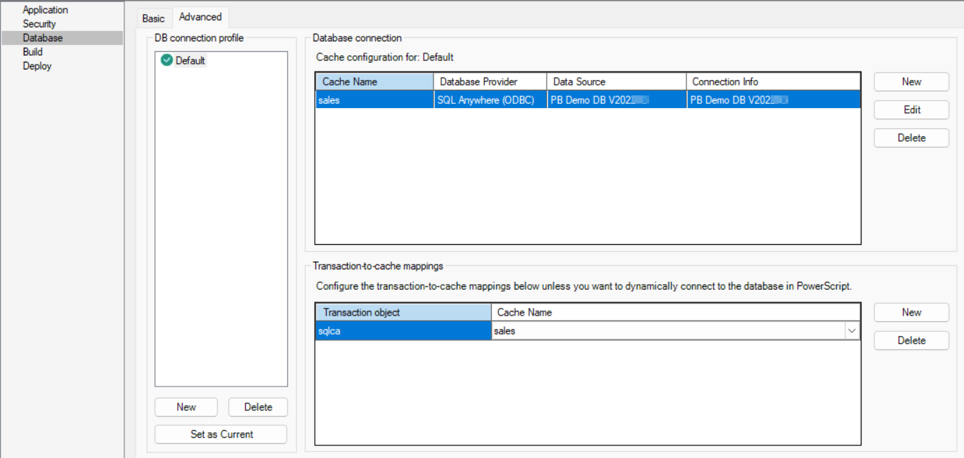 Click New to create a new database connection cache or click Edit to modify an existing cache. See Configure the database connection in the Database Configuration dialog for more details. If your application involves multiple databases, you will have to configure multiple caches here. The IDE will attempt to connect using the cache in sequence when it parses the DataWindow and generates the C# model. If none of the caches succeed (for example, if a DataWindow object references a database table that doesn't exist in any of the configured databases), the parsing error will be displayed in the IDE > Output window. |