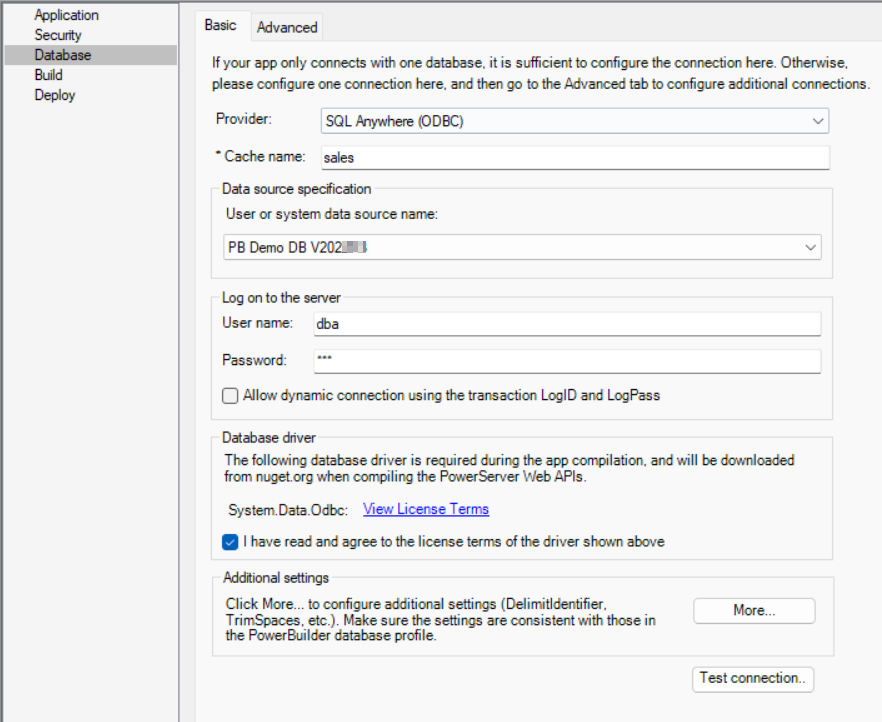 Select the database provider for connecting with the application database. The database connection will be used at both deployment and runtime: 1) when converting the PowerBuilder DataWindow objects to PowerServer C# models during the deployment process; and 2) when accessing data from the database at application runtime. See Configure the database connection for more details. |