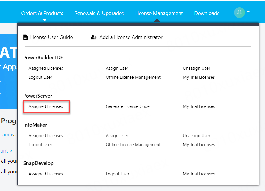 Step 1: Log into the Appeon User Center, click License Management, and then click Assigned Licenses under PowerServer.