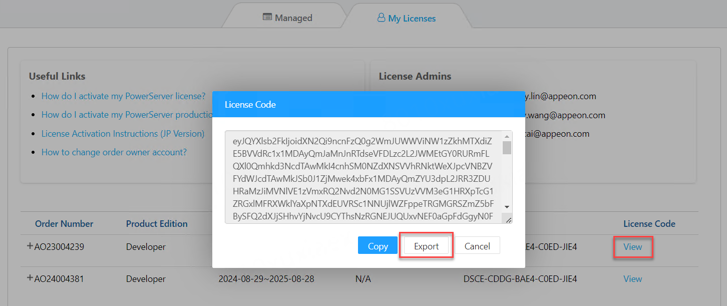 Step 2: On the My Licenses tab page, click View, and then click Export to export the license code to a TXT file ([LicenseKey].txt) and save the file on the local machine.
