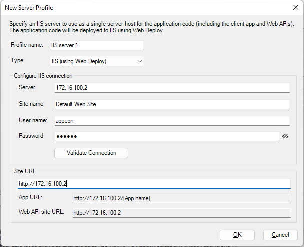 Step 3: In the New Server Profile dialog, specify a name for the profile in the Profile name field, and then select IIS (using Web Deploy) from the Type list.