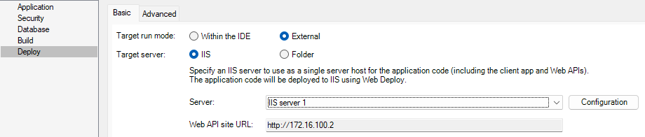 Step 2: Select External as the target run mode, and then select IIS as the target server.
