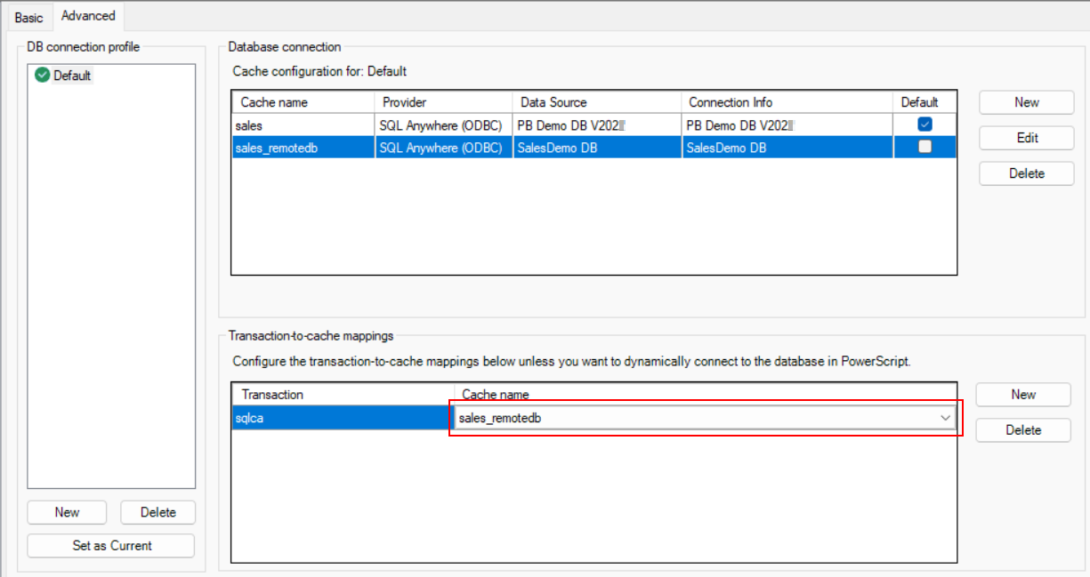 Step 5: Then select the database cache you created just now to map with the "sqlca" transaction object.