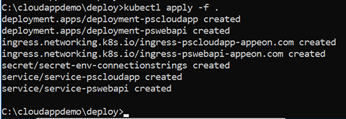 This command parses the manifest files existing in the current directory and creates the Kubernetes pods, services, ingress, and secret.