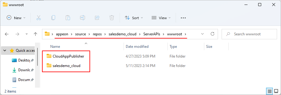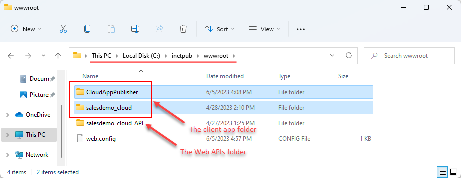 When deploying to the built-in Kestrel server, the client app is deployed to the wwwroot folder within the Web APIs (for example, %username%\source\repos\salesdemo_cloud\ServerAPIs\wwwroot).