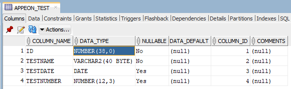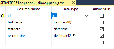 CREATE TABLE appeon_test (id integer NOT NULL,testname varchar(40) NOT NULL , testdate date , testnumber decimal(12,3) , PRIMARY KEY (id))