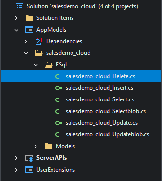 During the compilation process, the embedded SQL statements will be placed into the CS file under the PowerServer C# solution > "AppModels" project > [appname] > "ESql" folder according to their types, for example, Delete, Insert, Select, SelectBlob, Update, UpdateBlob etc.