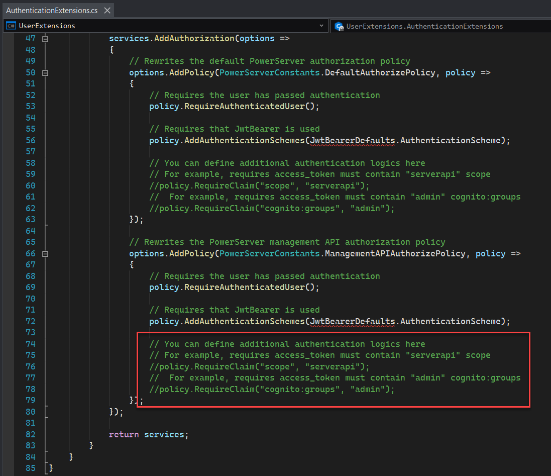 Note: You need to modify the code block under the comment "// Rewrite the PowerServer management API authorization policy". (as you want only users with specific roles to access the PowerServer Management APIs.)