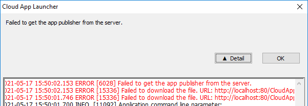 ERROR [12424] Failed to get the app publisher from the server. ERROR [34720] Failed to download the file. URL: https://[server_ip]:443/CloudAppPublisher/runtime/21.0.0.1150/manifest.json, Error description: HTTP error.(error code: 404).
