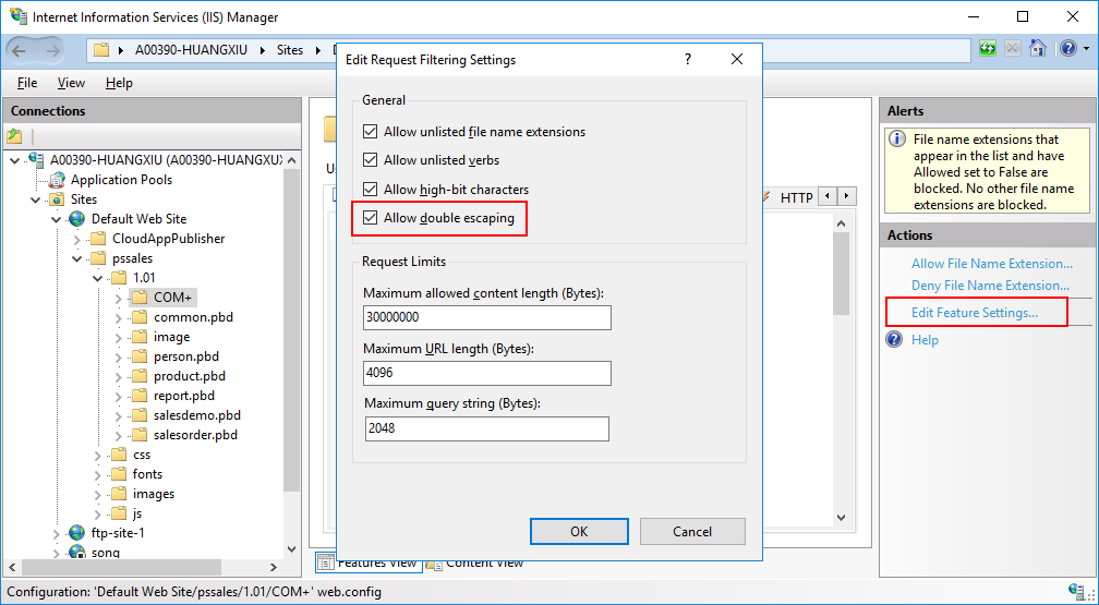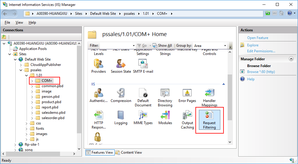 In IIS Manager, select the folder which contains the character "+" in the folder or file name, and then double click Request Filtering on the Features View.