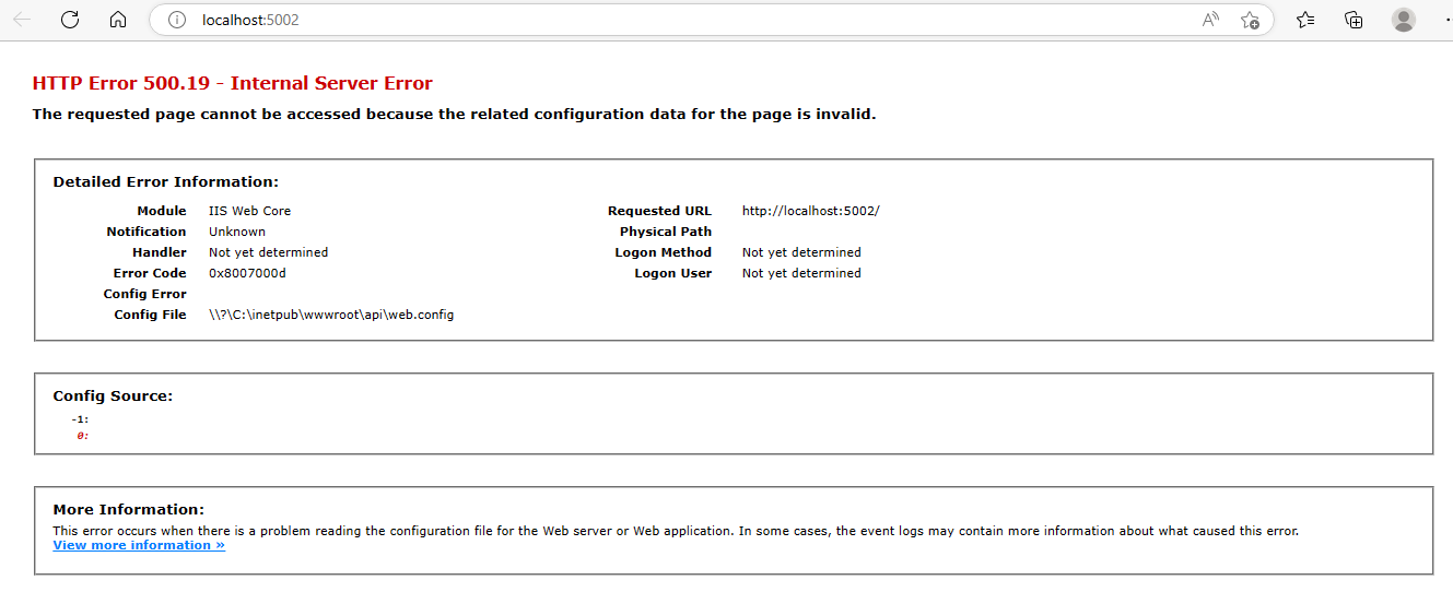 Server Error in Application "application name" HTTP Error 500.19 – Internal Server Error HRESULT: 0x8007000d Description of HRESULT The requested page cannot be accessed because the related configuration data for the page is invalid.