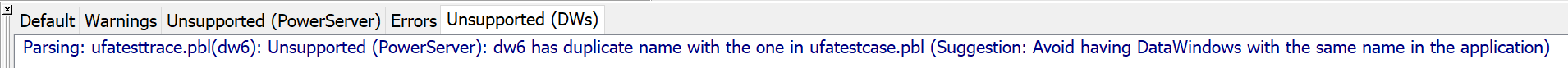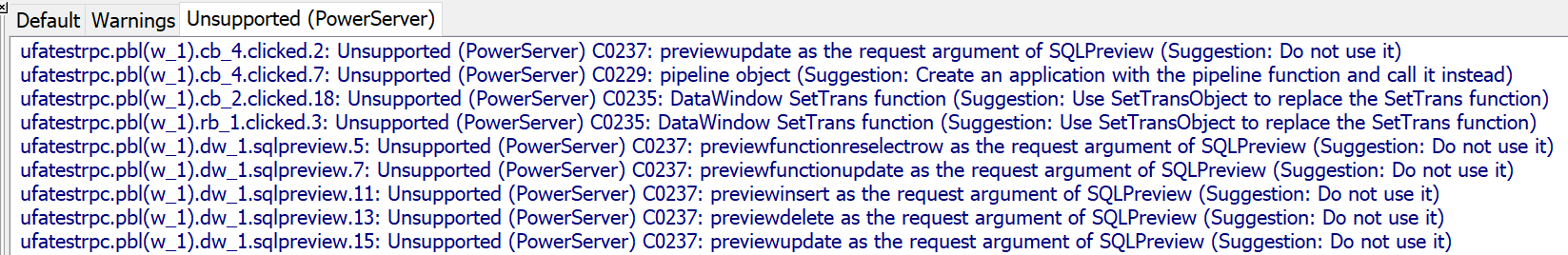 If any unsupported feature is detected, it will be displayed in the Output window | Unsupported (DWs) tab or Unsupported (PowerServer) tab.