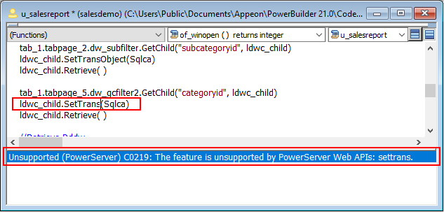 The PowerScript features will be analyzed during the build & deploy process; and if any feature is detected to be unsupported by the PowerServer Web APIs, it will be reported as an unsupported feature in the Output window. Please note that not every unsupported feature can be detected and listed, therefore, it is strongly recommended that you go through the unsupported features/scenarios and discrepancies documented in this guide and make sure they do not exist in your application.