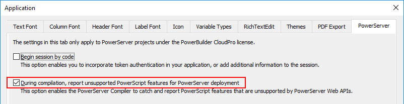 The unsupported feature analysis option is disabled by default. To enable this option, open the Application painter's Properties view, and select the option "During compilation, report unsupported PowerScript features for PowerServer deployment" in the PowerServer tab page.