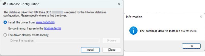 Select the first option "Install the driver from www.nuget.org" if you want to have PowerBuilder automatically download and install the driver, and if you agree with the license agreement. The driver will be automatically downloaded to your local path (%USERPROFILE%\.netdbdrives).