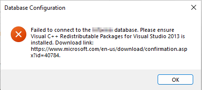 Note: the .NET Core data provider for DB2 (Net.IBM.Data.DB2 8.0.0.300) requires the Visual C++ Redistributable Packages for Visual Studio 2013 to run. If the Visual C++ Redistributable Packages for Visual Studio 2013 is not installed, you will be prompted when creating the database cache in the PowerBuilder IDE.