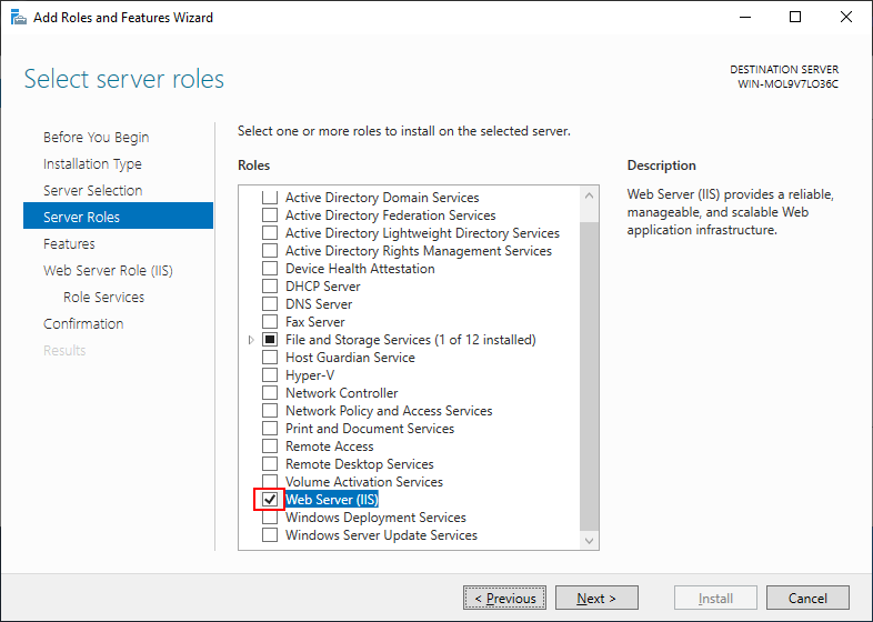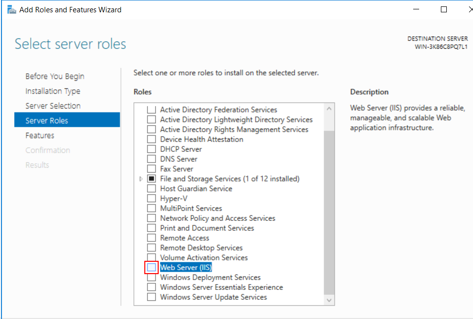 Step 2: In the Add Roles and Features Wizard, click Next several times until the Server Roles section displays; then select the check box of Web Server (IIS).