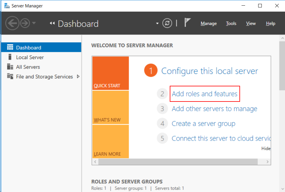 Step 1: In Windows Server 2019, open Server Manager, and then select Add roles and features.