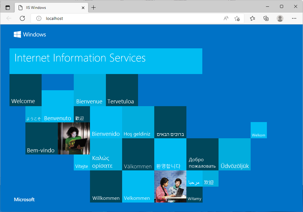 If the IIS welcome screen displays, IIS and the default web site are working properly.