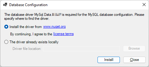 Select the first option "Install the driver from www.nuget.org" if you want to have PowerBuilder automatically download and install the driver, and if you agree with the license agreement. The driver will be automatically downloaded and installed to your local path (%USERPROFILE%\.netdbdrives).