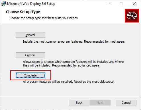 Step 2: (IMPORTANT) Make sure to select the Complete setup type when installing Web Deploy.