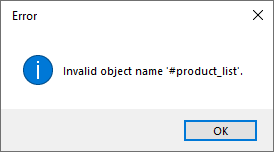 Or when creating a DataWindow dynamically using the SyntaxFromSQL function, the retrieve operation fails with the error message "Invalid object name 'xxx'" due to the use of a temporary table (for example, #product_list).