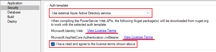 Select Use external Microsoft Entra ID service from the Web API authentication list box, view the license terms, and select the "I have read and agree to the license..." option.
