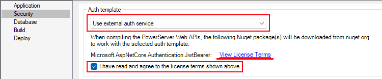 Select Use external auth service from the Web API authentication list box, view the license terms, and select the "I have read and agree to the license..." option.