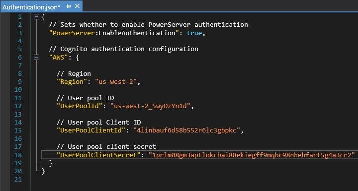Open the Authentication.json file and specify the AWS Cognito user pool (including region, user pool ID, user pool client ID, and user pool client secret) that will be used to validate the identity token passed from the client.