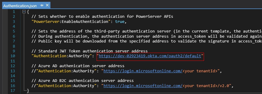 Open the Authentication.json file, and specify the Issuer URI of authorization server in the "Authentication:Authority" key. For example: