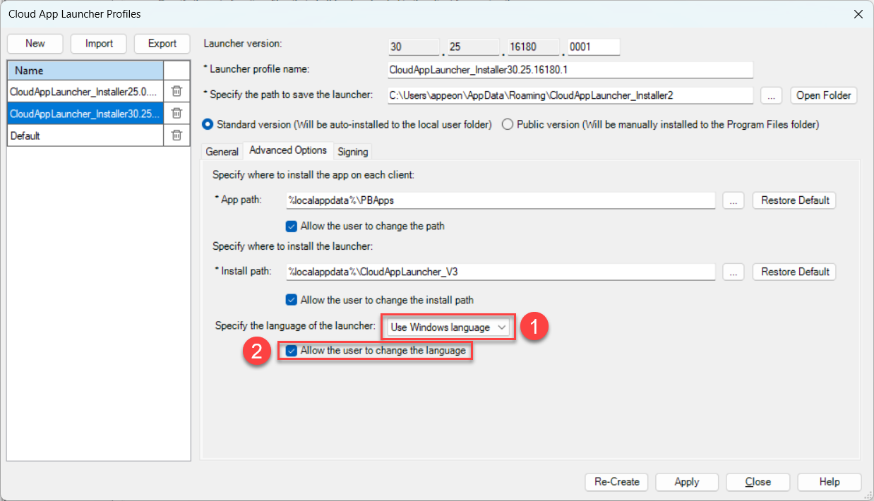 (Runtime only) Developers can also choose to allow the user to change the language for the launcher runtime resources during the launcher installation process. (②)
