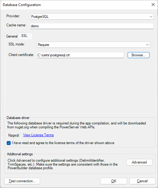 To create a database connection cache for the PostgreSQL database using the SSL method: