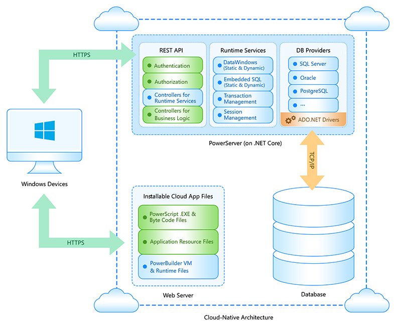 PowerServer allows for the automatic deployment of PowerBuilder projects as "installable cloud apps," which can be installed on desktops or tablets. These cloud apps store their databases and related operations in the cloud (rather than on-premise), with automatic client deployment over the Internet. You can think of "installable cloud apps" as modern desktop applications that require an internet connection for installation and operation.