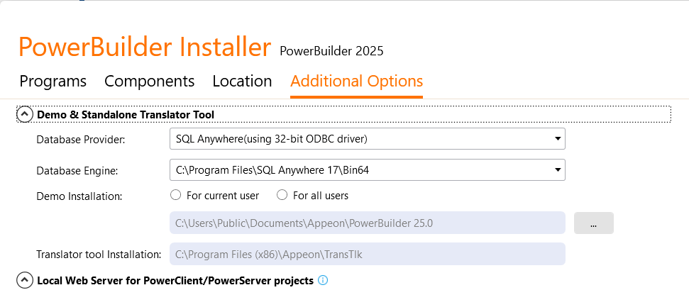 Step 4: Select the Additional Options tab and make sure the SQL Anywhere engine is selected. A 32-bit ODBC driver is required as PowerBuilder IDE is a 32-bit program. If you select to use the PostgreSQL engine for running the PowerBuilder demo database, make sure both the PostgreSQL client (included in Command Line Tools of the PostgreSQL Windows installer) and PostgreSQL ODBC driver (32-bit) are installed. The demo database file is automatically installed to %Public%\Documents\Appeon\PowerBuilder [version]\ and the corresponding ODBC data source is automatically created during the PowerBuilder installation.