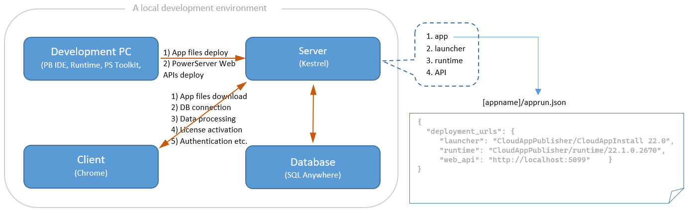 "A local development environment" does not mean the development PC only; it means all roles in one machine, as illustrated in the following graph. And this represents only one supported environment (not all), for example, the built-in Kestrel web server is used as the server here (although IIS etc. is also supported), the SQL Anywhere database is used as an example (although PostgreSQL, SQL Server, Oracle etc. can also be used), Chrome is used to browse the app (although Firefox and Edge can also be used). For all supported environment, refer to Installation > Installation requirements.